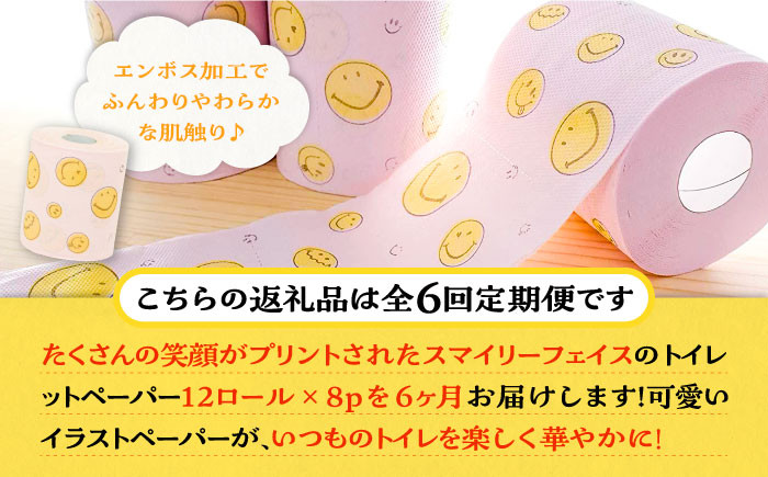 スマイリーフェイスがプリントされたトイレットペーパーです 【全6回定期便】トイレットペーパー ダブル 25m 12ロール×8パック スマイリーフェイス 《豊前市》【大分製紙】 [VAA026] 備蓄 防災 まとめ買い 日用品 消耗品 常備品 生活用品 大容量 トイレ