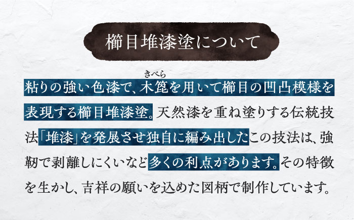 艶やかで平滑な漆器と違い表面の凹凸模様が特徴(魅力)でその塗膜は剥離しにくく堅牢。