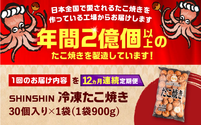 | 容量 | 以下の内容を全12回(月1回)お届けします。 SHINSHINたこ焼き 1袋30個入り(900g) 【加工地】 豊前市 |