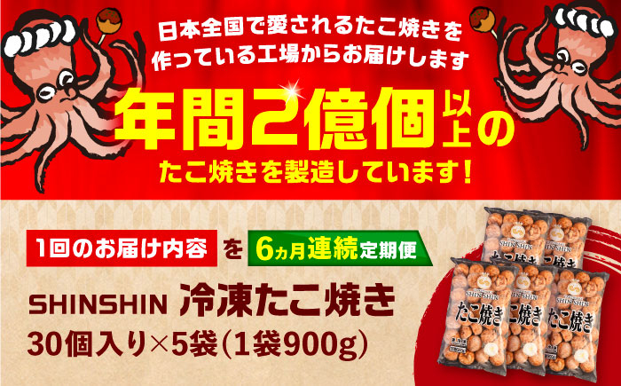 | 容量 | 以下の内容を全6回(月1回)お届けします。 SHINSHINたこ焼き 1袋30個入り(900g)×5袋 【加工地】 豊前市 |