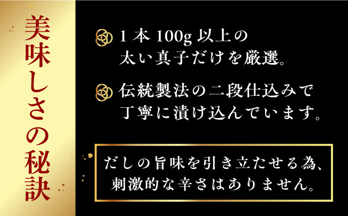 1本100g以上の太い真子だけを厳選し、伝統製法の二段仕込みで丁寧に漬け込んでいます。