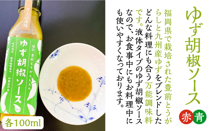 福岡県で栽培された豊前とうがらしと九州産ゆずをブレンドした、どんな料理にも合う万能調味料です。