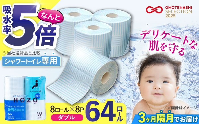 濡れても強く、肌につきにくい。だから「当てるだけ」 【隔月配送 全3回定期便】トイレットペーパー HOZO 17m 8ロール×8パック ウォシュレット シャワートイレ 対応 無香料 《豊前市》【大分製紙】備蓄 防災 まとめ買い 日用品 消耗品 常備品 生活用品 大容量 トイレ [VAA080]