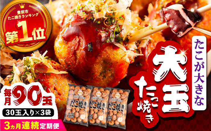 タコが大きな和風味のSHINSHINたこ焼き!! 【全3回定期便】タコが大きな和風味 SHINSHINたこ焼き 30個入り ×3袋 《豊前市》 【SHIN SHIN】 冷凍 大粒 たこ焼き [VAT032]