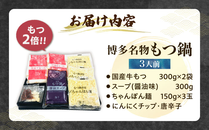 もつ モツ 福岡名物 博多 モツ鍋 【牛もつ2倍!】【ご家庭用】博多もつ鍋(醤油味)3人前 《豊前市》【株式会社 海千】 [VEC010]