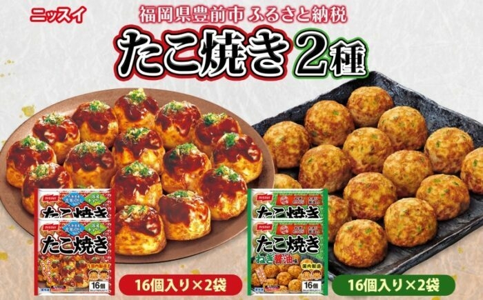 自宅で手軽に本格的! 「ニッスイ たこ焼き2種」です。 たこ焼き 2種2個(16個)各2個(計1.28kg)《豊前》 【日本ふるさと創生】 [VEM010]