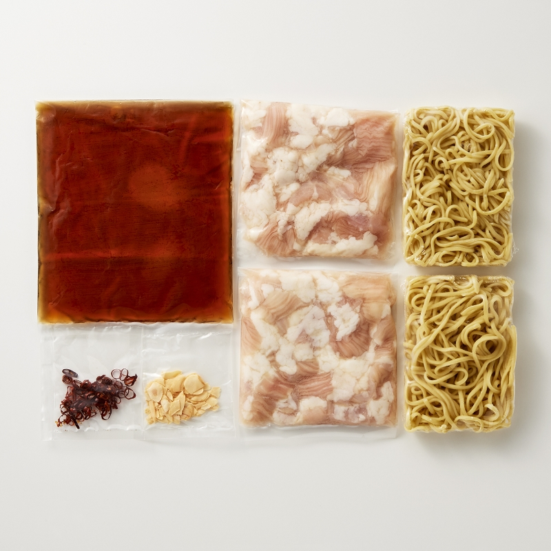 牛モツ:アメリカ産牛シマチョウ 醤油スープ:醤油(国内製造)、清酒、かつお調味エキス/調味料(アミノ酸)、(一部に小麦、大豆を含む)