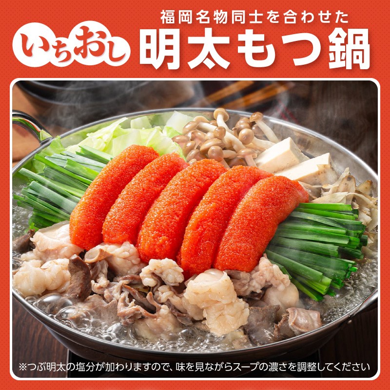 スープを薄味に仕上げたもつ鍋につぶ明太をたっぷり絞ってスープに混ぜれば、明太子の粒感とぷりぷりのもつがよく合う一品の出来上がりです!