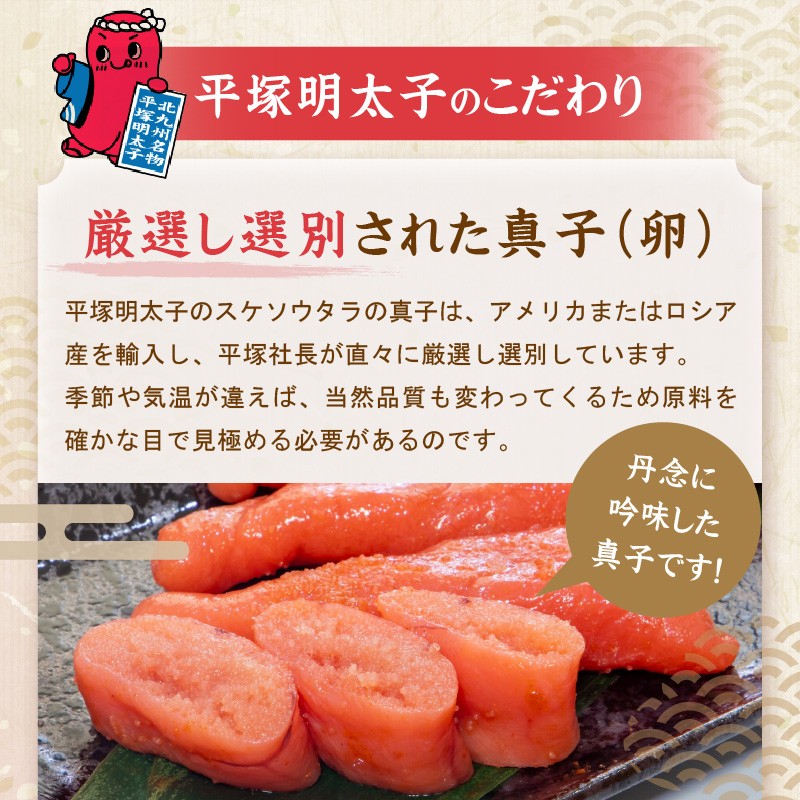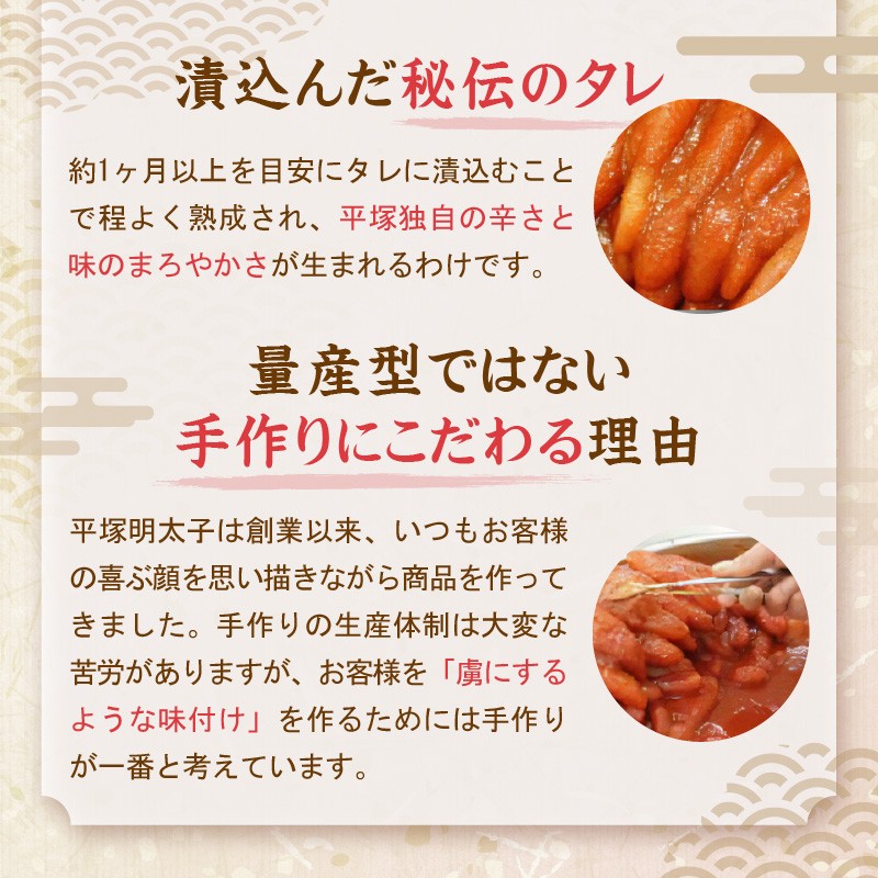 平塚“秘伝”の味がぎゅっと詰まった自信の辛子明太子です。