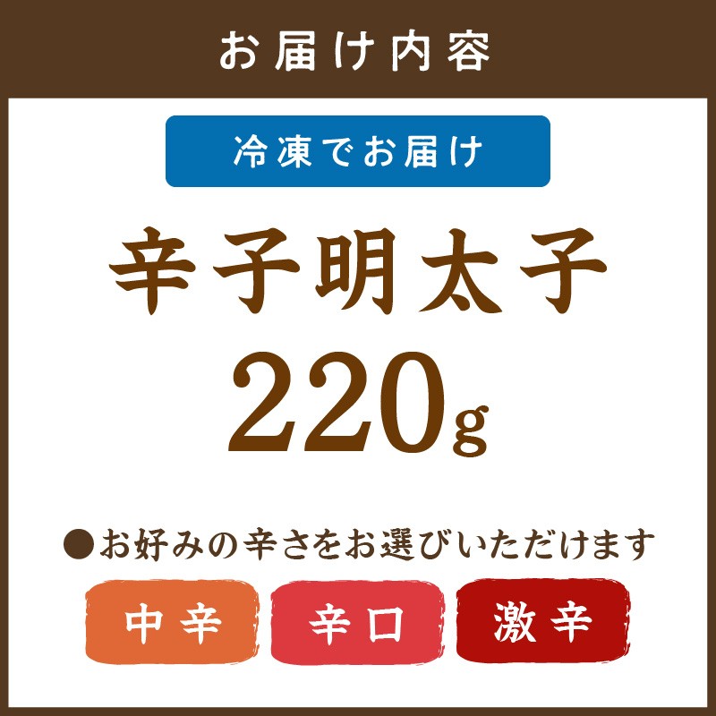 | 容量 | 辛子明太子220g×1個 ◎辛さをお選びください ・中辛 ・辛口 ・激辛 |