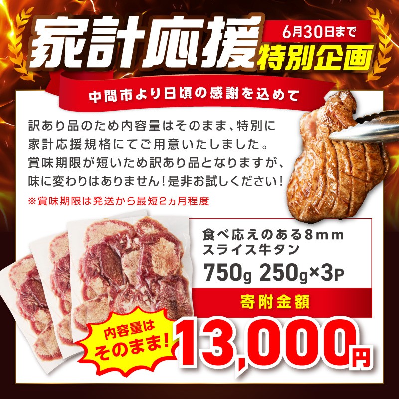 味付け済だからそのまま焼くだけ!コリコリな食感がたまらない厚切り牛タンをお届け! 【家計応援企画】食べ応えのある8mm スライス牛タン 250g×3 計750g【034-0095】 牛たん 訳アリ わけあり 肉 牛肉 タン 牛タン ぎゅうたん ギュウタン スライス 焼肉 焼き肉 冷凍 冷凍保存 簡単調理 小分け 個包装 下味付け 味付き 焼くだけ BBQ バーベキュー 肉 厚切 厚切り