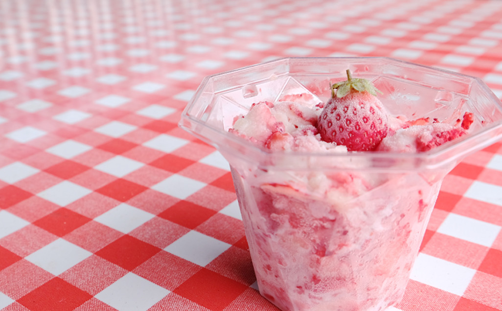ふんわり削ったいちごをカップ詰めし、いちご屋ならではの葉付きいちごを
