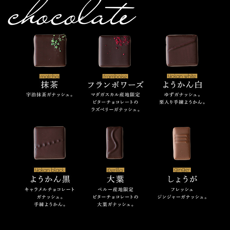定番のビター、ミルクをはじめ、ラズベリーの風味が香るフランボワーズ、抹茶、自家製黒羊羹入のガナッシュなど個性的なショコラを製作しています。