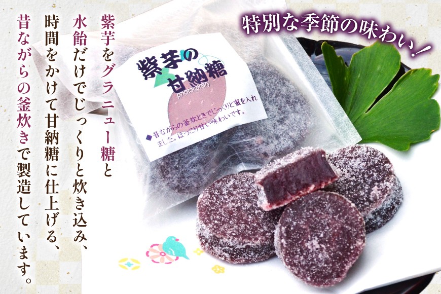 紫芋そのものをカットして、グラニュー糖、水飴でじっくりと炊き込み、約10日間ほどかけて甘納糖に仕上げる、昔ながらの釜炊きで製造。