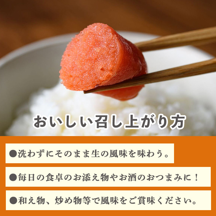 吟味された原料をひとつひとつ丹念に秘伝のタレに漬け込んだ深い味わいの明太子