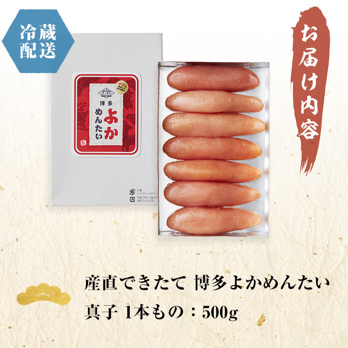 漬け上がりのプチプチとした食感と旨味をそのままにお届け <無冷凍>辛子明太子 博多よかめんたい 生 1本もの(500g) 贈答用 めんたいこ 真子 冷蔵 海鮮 お土産 <離島配送不可>【ksg0407】【富八商店】