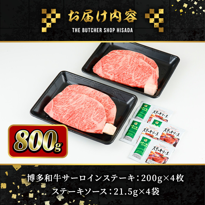 華やかな香りと濃厚な旨味を併せ持つ「サーロインステーキ」をご堪能下さい。 博多和牛サーロインステーキ(200g×4枚・計800g) 牛肉 黒毛和牛 国産 ステーキ <離島配送不可>【ksg0419】【久田精肉店】