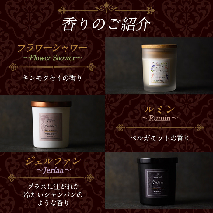 | 容量 | ■アロマキャンドル3個 ・フラワーシャワー キンモクセイの香り ・ルミン ベルガモットの香り ・ジェルファン グラスに注がれた冷たいシャンパンのような香り (1個当たり:高さ8.3mm・直径6.5mm・容量136g) ■専用マッチ |