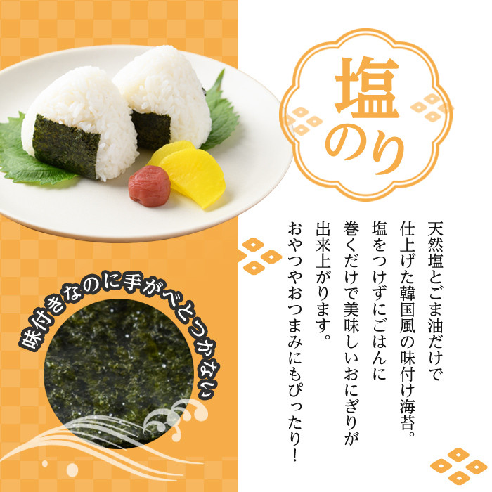 当店で大人気の無添加の味付け海苔、焼き海苔、塩海苔(または味付海苔濃いめ)の3種類入り。