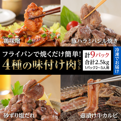 焼くだけ簡単!味付け肉セット《合計2.5kg》_ 焼肉 焼き肉 焼肉セット 牛肉 豚肉 鶏肉 ハラミ カルビ 砂ずり 塩だれ 味噌 壺漬け 惣菜 BBQ おかず おつまみ タレ漬け 送料無料 家庭用 小分け バーベキュー 【1221860】