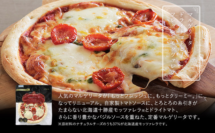人気のマルゲリータが「もっとフレッシュに。もっとクリーミー。」になってリニューアル。 自家製トマトソースに、とろとろの糸引きがたまらない北海道十勝産モッツァレラ※とドライトマト、さらに香り豊かなバジルソースを重ねた、定番マルゲリータです。
