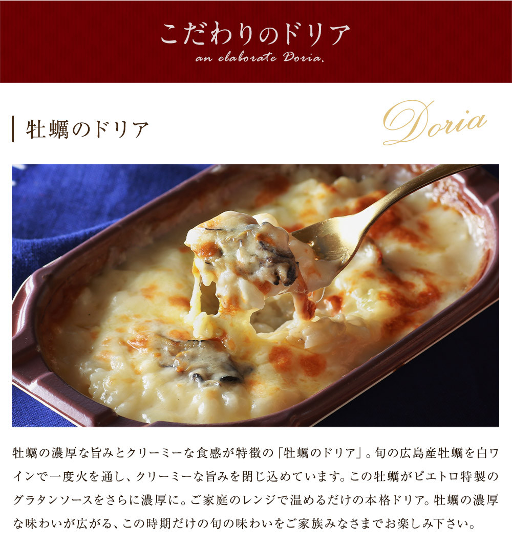 牡蠣の濃厚な旨みとクリーミーな食感が特徴の「牡蠣のドリア」。旬の広島産牡蠣を白ワインで一度火を通し、クリーミーな旨みを閉じ込めています。この牡蠣がピエトロ特製のグラタンソースをさらに濃厚に。ご家庭のレンジで温めるだけの本格ドリア。牡蠣の濃厚な味わいが広がる、この時期だけの旬の味わいをご家族みなさまでお楽しみ下さい。