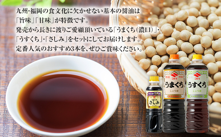 ロングセラーのニビシ醤油の定番人気の醤油のセット。 ニビシ 醤油おすすめ 3本セット 特級うまくちしょうゆ1L×1本/上級うすくちしょうゆ1L×1本/特級うまくちさしみしょうゆ360ml×1本 しょうゆ 九州醤油 定番 福岡県産 国産 送料無料