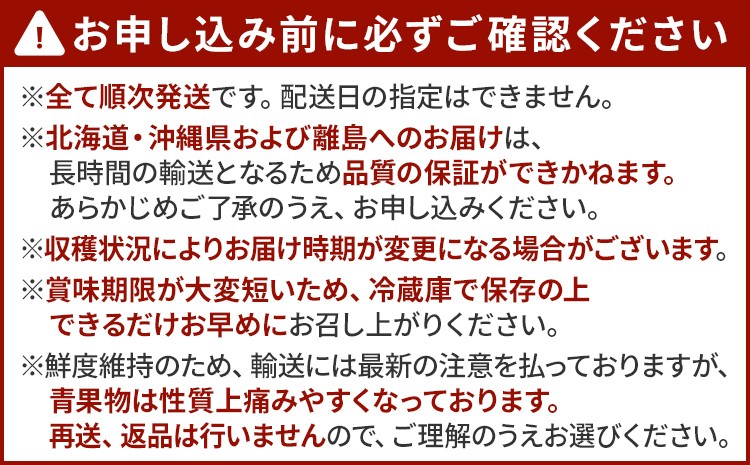 ※鮮度維持の為、輸送には細心の注意を払っておりますが、青果物は性質状傷みやすくなっております。消費期限内にお受け取りされずに保管期限を過ぎて返送されたり品質に問題が生じたりした場合は、再送、返品は行いませんので、ご理解の上お選びください。