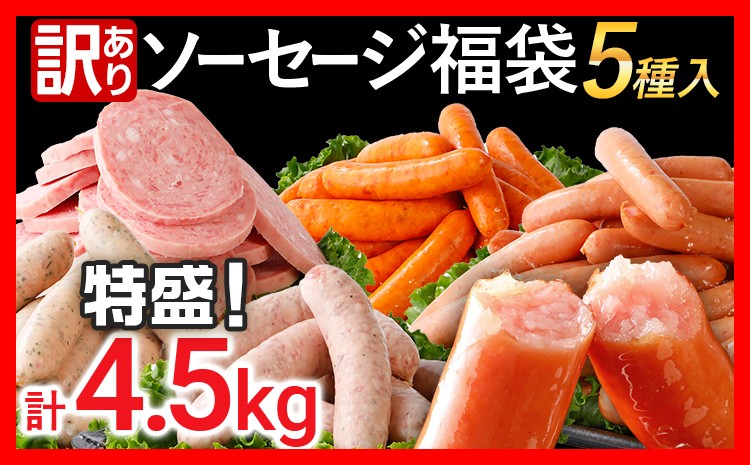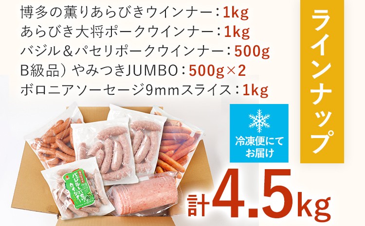 大人気の博多の薫りの入ったソーセージ福袋! 訳あり ソーセージ福袋 おかず 惣菜 ウインナー ソーセージ 5種セット 合計4.5kg 大容量 特盛 粗挽き 食べ比べ 冷凍 ストック おつまみ 博多の薫り やみつきJUMBO あらびき大将 バジル&パセリポークウインナー ボロニア