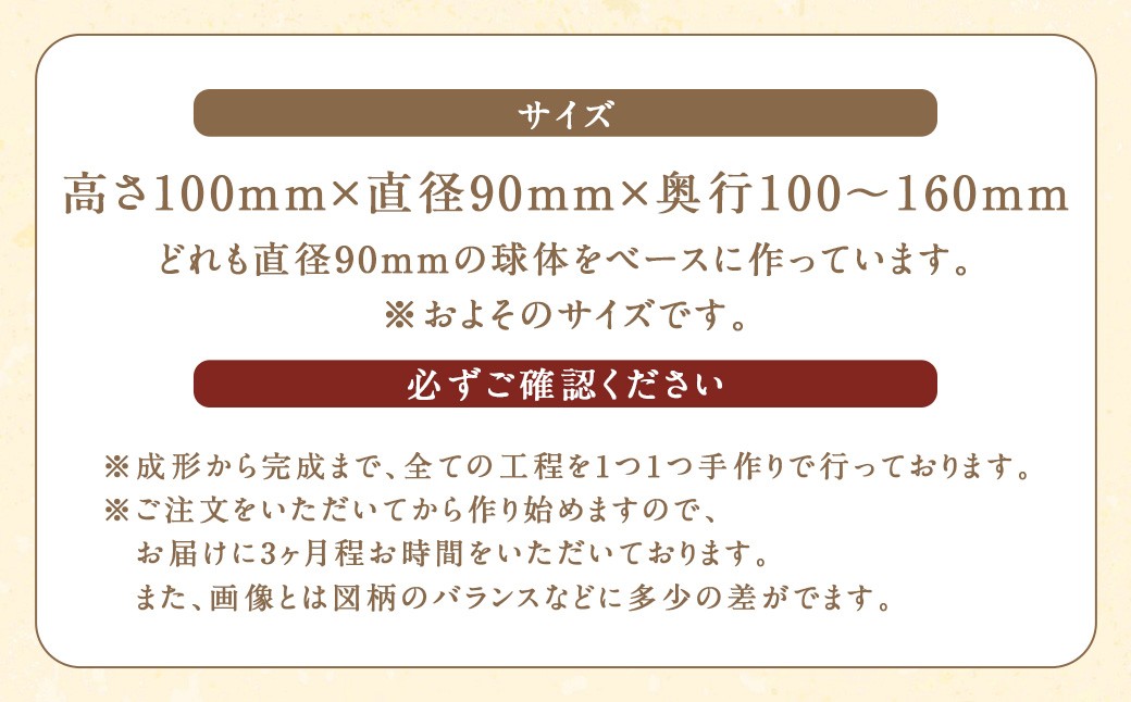 | 容量 | 1個(トリ) サイズ:高さ100mm×直径90mm×奥行100から160mm※出来上がりの表情や色合いに画像とは多少の差が出ます。お届けに3ヶ月程かかります。 |