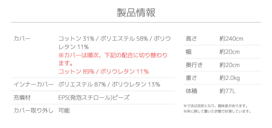 | 容量 | ▽Yogibo CaterpillarRollLong(ヨギボー キャタピラーロールロング) 1点 【サイズ】 高さ:約240cm 幅:約20cm 奥行き:約20cm 重さ:約2.0kg 体積:約77L ※寸法は目安となり、個体差があります。 ※床に倒して置いた状態で計測しています。 加工地:福岡県宮若市 ------------------------------------------------ 【素材】 カバー:コットン 89% / ポリウレタン 11% インナーカバー:ポリエステル 87% / ポリウレタン 13% 充填材:EPS(発泡スチロール)ビーズ |