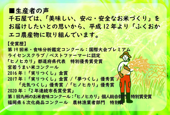 千石屋では、 「美味しい、安心・安全なお米づくり」をお届けしたいとの思いから、平成12年より「ふくおかエコ農産物に取り組んでいます。(ふくおかエコ農産物認証制度とは、化学合成農薬の散布回数(成分回数)と化学肥料(窒素成分)の使用量をともに県基準の半分以下で生産する栽培計画を認証する制度です。 認証取得:0410069/毎年更新)