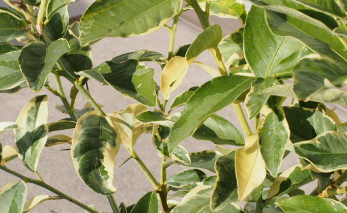 レモンの木の新種ピンクレモネード、斑入りの葉が珍しい品種です。
