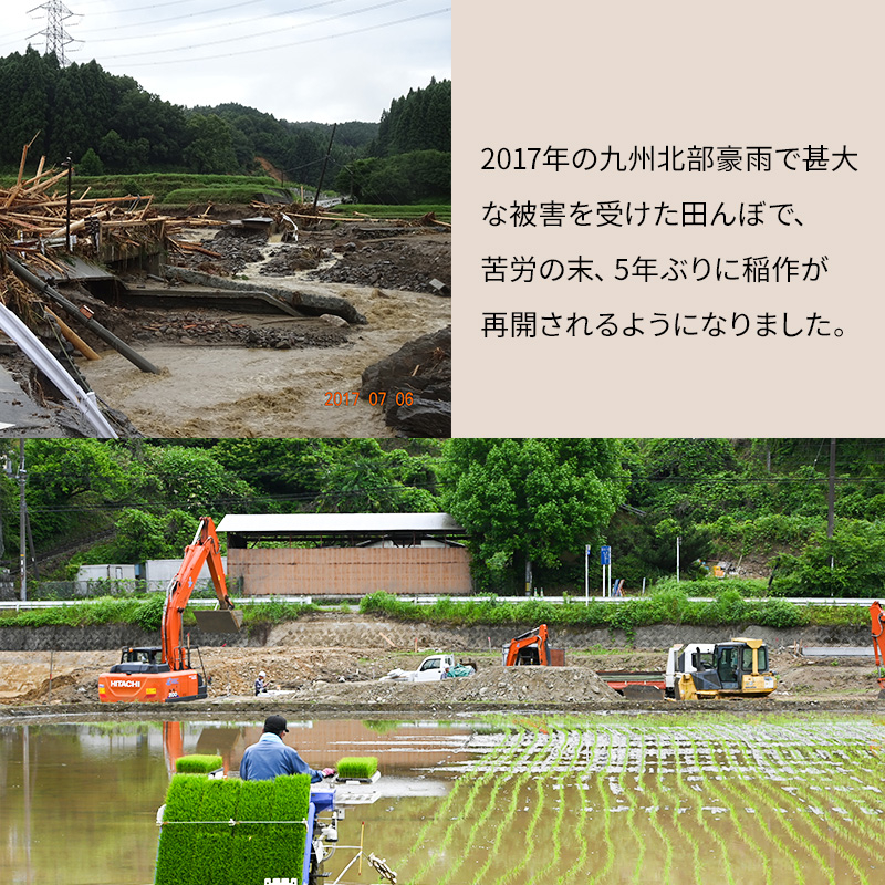 2022年には、被災した田んぼで、苦労の末、5年ぶりに稲作が再開されるようになりました。多くの方の尽力で復活した田んぼで穫れた、奇跡のお米をお届けします。
