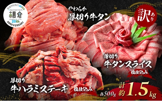 【朝倉市制施行20周年記念企画】 訳あり やわらか厚切り 牛タン 500g+ 薄切り 牛タンスライス 塩仕込み 500g+ 厚切り 牛ハラミ ステーキ 塩仕込み 計1.5kg(500g×3p) ※配送不可:離島