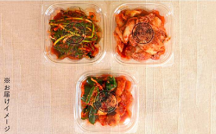 ※こちらは全3回お届けの定期便商品です。 糸島で作られている、韓国の伝統的な製法で漬け込まれた美味しいキムチ。 キムチの味の決め手になるヤンニョムは、それぞれのお野菜に合わせ、配合や混ぜ込むものを変えています。 白菜キムチ好きで、他の味も楽しみたい方に、3種セット(3パック)でお届けいたします。 ■白菜キムチ:450g 味の決め手は、キムチの漬け材料である「ヤンニョム」 韓国産の唐辛子をはじめ、ニンニク、生姜、イカの塩辛などを混ぜ合わせ、先代が試行錯誤して作り上げたもの。 開封日と数日後で、発酵具合により異なった美味しさが楽しめます。 毎日少しずつつまみながら自分好みの発酵具合を見つけるのも楽しい。 発酵が進み、酸味が増したキムチは、鍋やチャーハンにすると更に美味しくお召し上がりいただけます。 11月~2月の中旬に使用する白菜は、地元の契約農家から仕入れた糸島の白菜を使っています。 ■葱キムチ:90g 白菜やキュウリのキムチに比べて水分量が少なく、しっかりとした濃いヤンニョムの味が楽しめます。 少量でも食べ応えがあり、シャキシャキとした葱の歯ごたえは白米を食べる手をとめさせない美味しさ。 焼肉の際に肉で巻いて食べたり、冷奴に乗せて食べるのもおすすめです。 ■大根と胡瓜の混ぜキムチ:140g キムチが好きなら、この2種のお野菜も欠かせません。 しっかりと味が絡んだヤンニョムとカリコリとした食感のお野菜。 開封日と数日後で、発酵具合により異なった美味しさが楽しめます。 毎日少しずつつまみながら自分好みの発酵具合を見つけるのも楽しい。