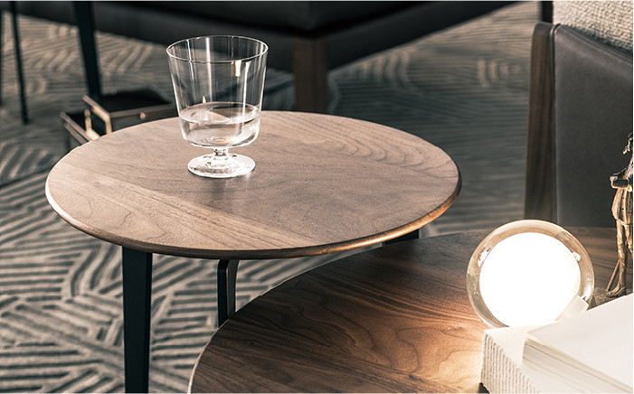 量感と温かみが魅力の無垢天板と、硬質でキレのあるスチール脚。 対極にある素材の共存が美しいデザインバランスを生み出し、力強さの中に洗練された個性を醸し出しています。 天板裏に回りこむ緩やかなふくらみは、見えない部分にデザインの奥行きを感じさせる、リッツウェルならではのこだわり。 スラリと延びた脚部に施されたブラック塗装は、フラットバーならではのシャープさと曲線が生むやさしさの、 相反する表情を際立たせながら、不思議な調和を見せています。 空間にスタイリッシュなリズムを作り出しながら、様々なシーンで機能性を発揮する、 サイズ違いのテーブルの組み合わせ使いも魅力の一つ。 日々の暮らしの中で使いこなすほどに、心地よい存在感を増していくテーブルです。