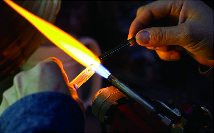 タビノキセキのアロマアクセサリーは、海と山に囲まれた糸島にある工房で、高温のバーナーを使用し、ガラス職人がひとつひとつ心を籠めて手作りで制作しています。