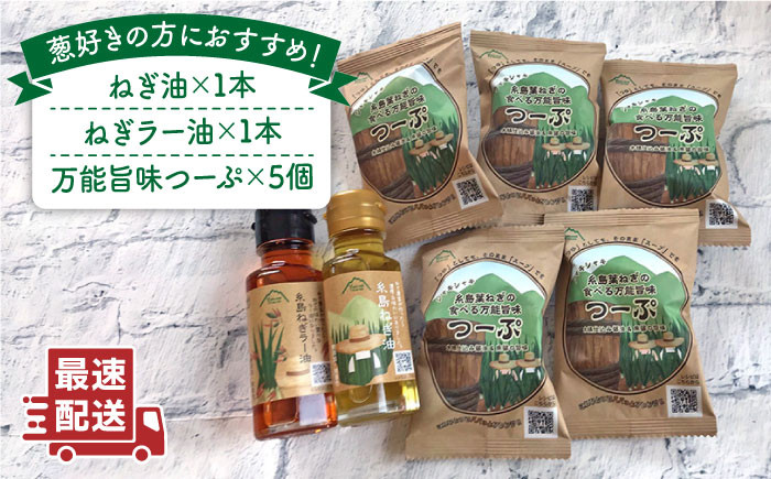 | 容量 | 糸島ねぎ油47g×1個 糸島ねぎラー油47g×1個 糸島葉ねぎの食べる万能旨味つーぷ×5個 |