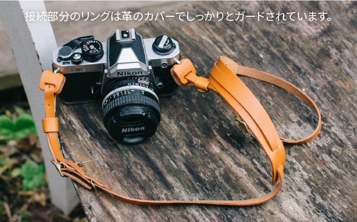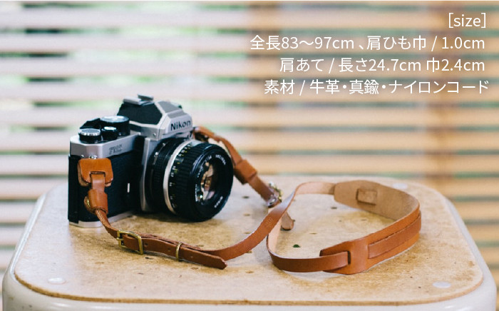 ナチュラルな質感の植物性タンニンなめしの革を使用。肩当てがカメラの重さを軽減します。真鍮のバックルによって83cmから97cmまで長さを調整可能です。