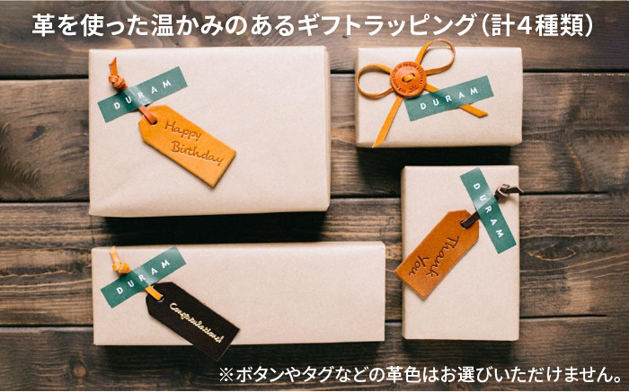 革のボタンやタグを使ったハンドメイド感があるギフトラッピング。