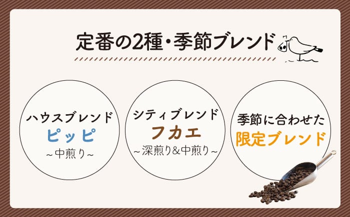 定番ブレンドコーヒー2種150g+季節ブレンドコーヒー150gを毎月1回、6ヶ月連続でお送りします。