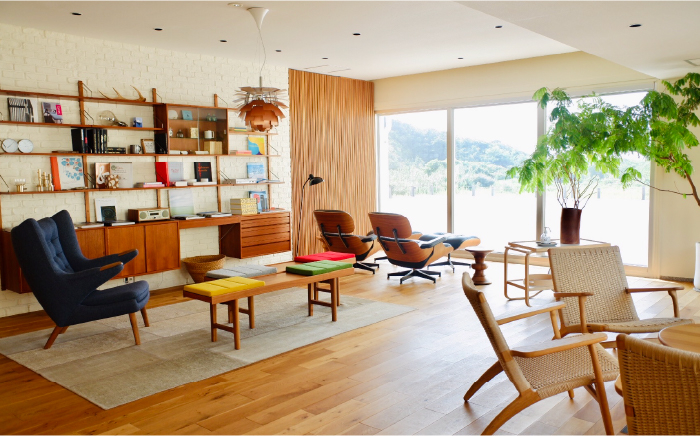 各部屋はハンス・J・ウェグナーやアルネ・ヤコブセン、ハーマン・ミラーなどのインテリア。