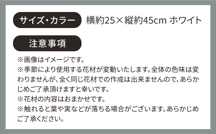 | 容量 | 1個 サイズ:横約25cm×縦約45cm カラー:ホワイト 【原料原産地】 薔薇、ユーカリ 全て糸島産 スターチス、パンパスグラス、ソリダコ、かすみ草一部糸島産 【加工地】 糸島市 |