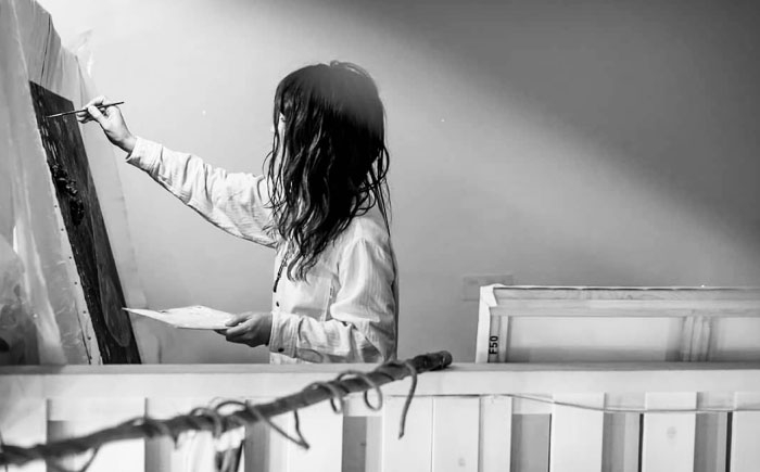 墨、柿渋、和紙、岩絵具など日本の風土により作られた画材と、楠や杉などの日本で古くから馴染みのある木材の廃材を使用し、作品として新たな巡りの中で甦らせています。