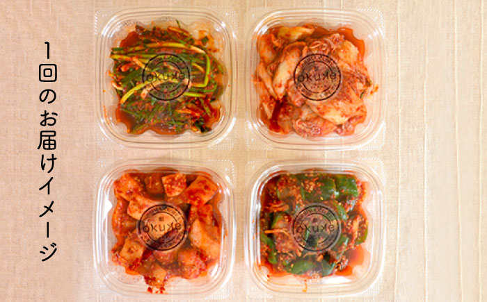 | 容量 | 以下の内容を全6回(月1回)お届けします。 ・白菜キムチ140g ・葱キムチ90g ・胡瓜キムチ140g ・大根キムチ140g |