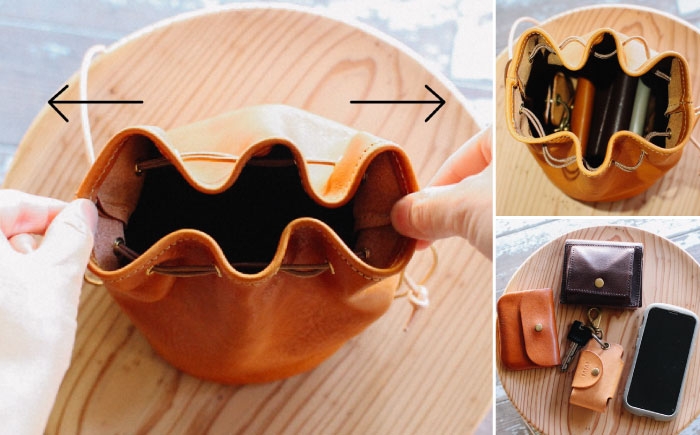 筒形ポーチの上部をナイロンコードで絞って閉じる、革の巾着ポーチ。