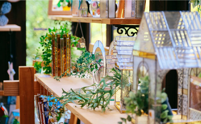 作品の一つ一つが完全オリジナルです。ガラスの多くはアメリカ(一部はメキシコに移転)、ドイツ製でハンドメイドの物も多用していて、そのガラスの奥深さは永く愛される逸品になるかと思います。