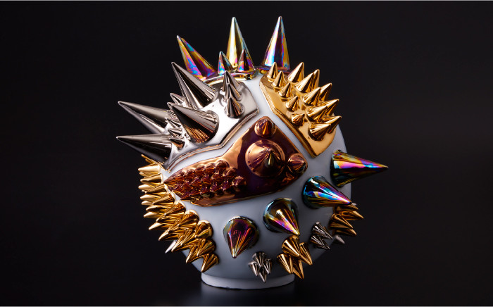 たとえば代表作《頬鎧盃》は、戦国武将の「変わり兜」をモチーフにしながらもそれらを現代的な造形へと生みなおし、