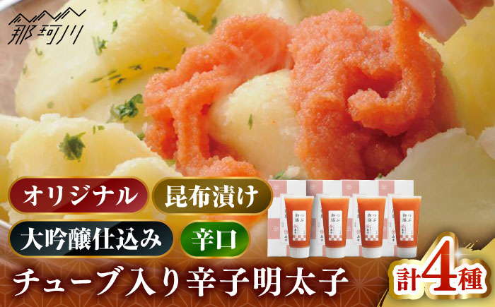 まな板・包丁・食器・箸を汚さず、簡単・便利にご利用頂けます 【博多辛子明太子の島本】希少国産卵・チューブ入り辛子明太子80g×4種(オリジナル・昆布漬け・大吟醸仕込み・辛口)<株式会社島本食品>那珂川市 [GER044]